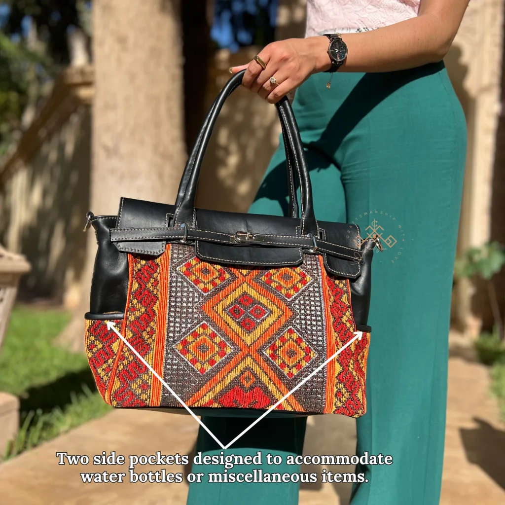 Artisan Black Leather Handbag – Luxe red-orange Kilim Shoulder Bag