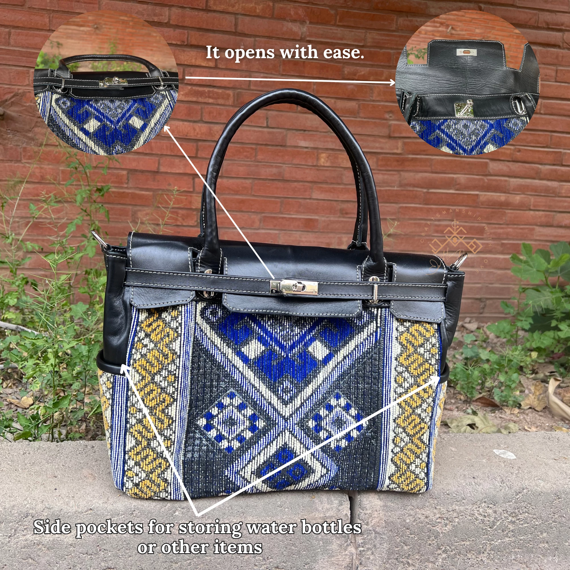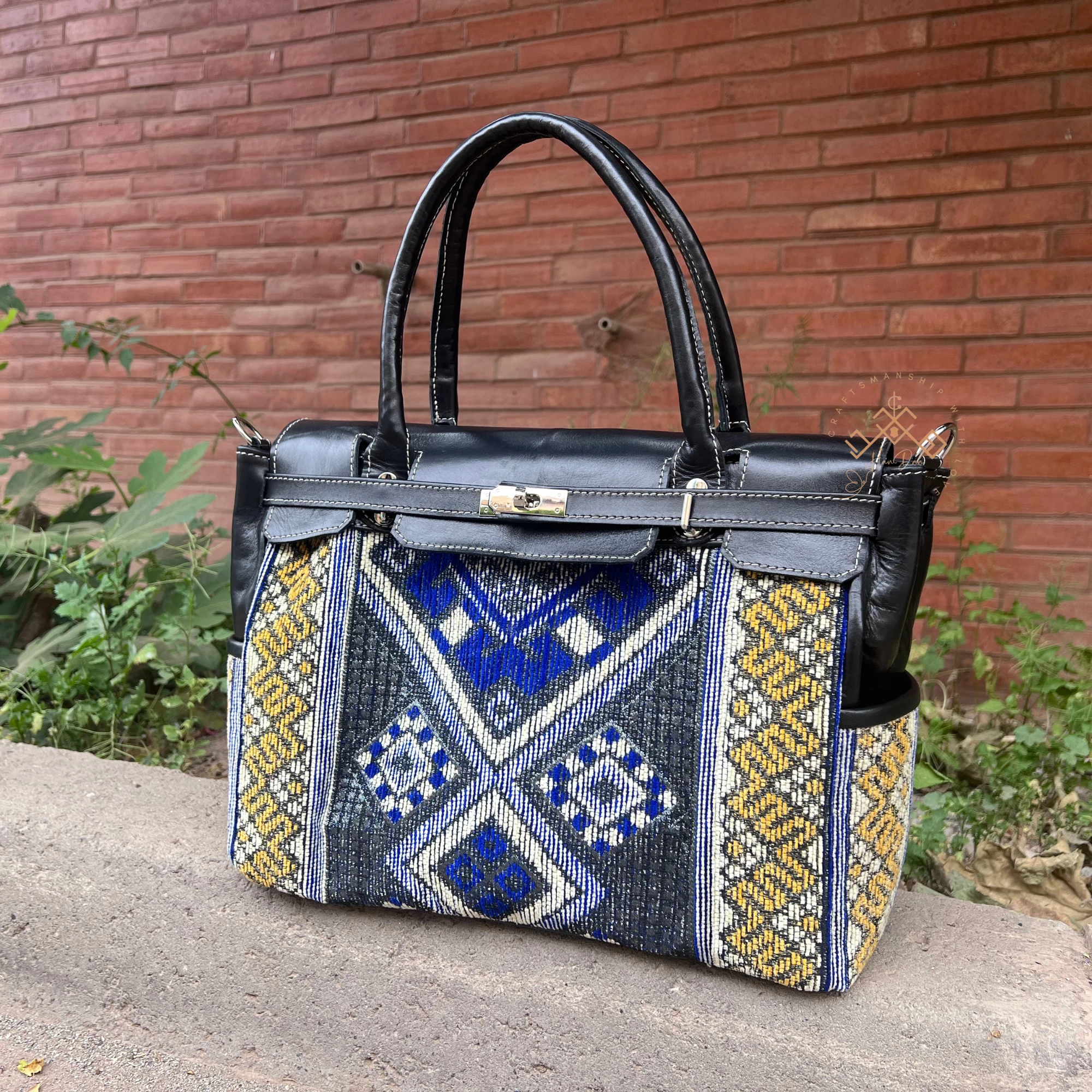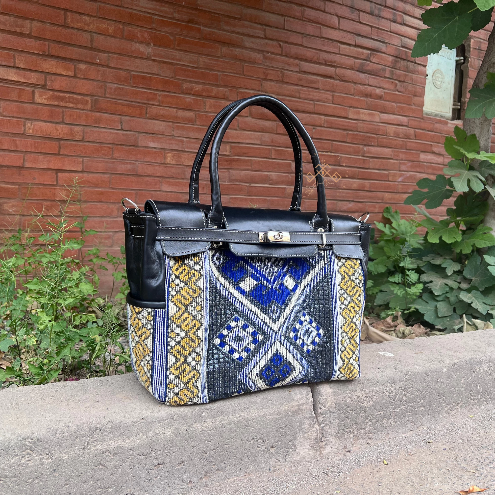 Black Leather & Blue Kilim Handbag – Unique Carpet Tote bags
