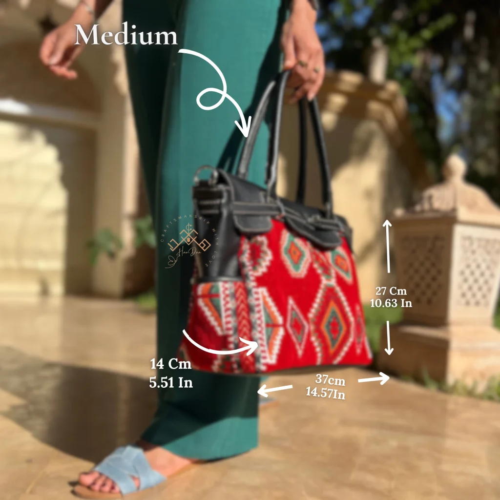 Introducing the stunning Black Leather Kilim Handbag. A luxe shoulder bag for women featuring a vibrant Red Kilim panel. Handcrafted and unique.