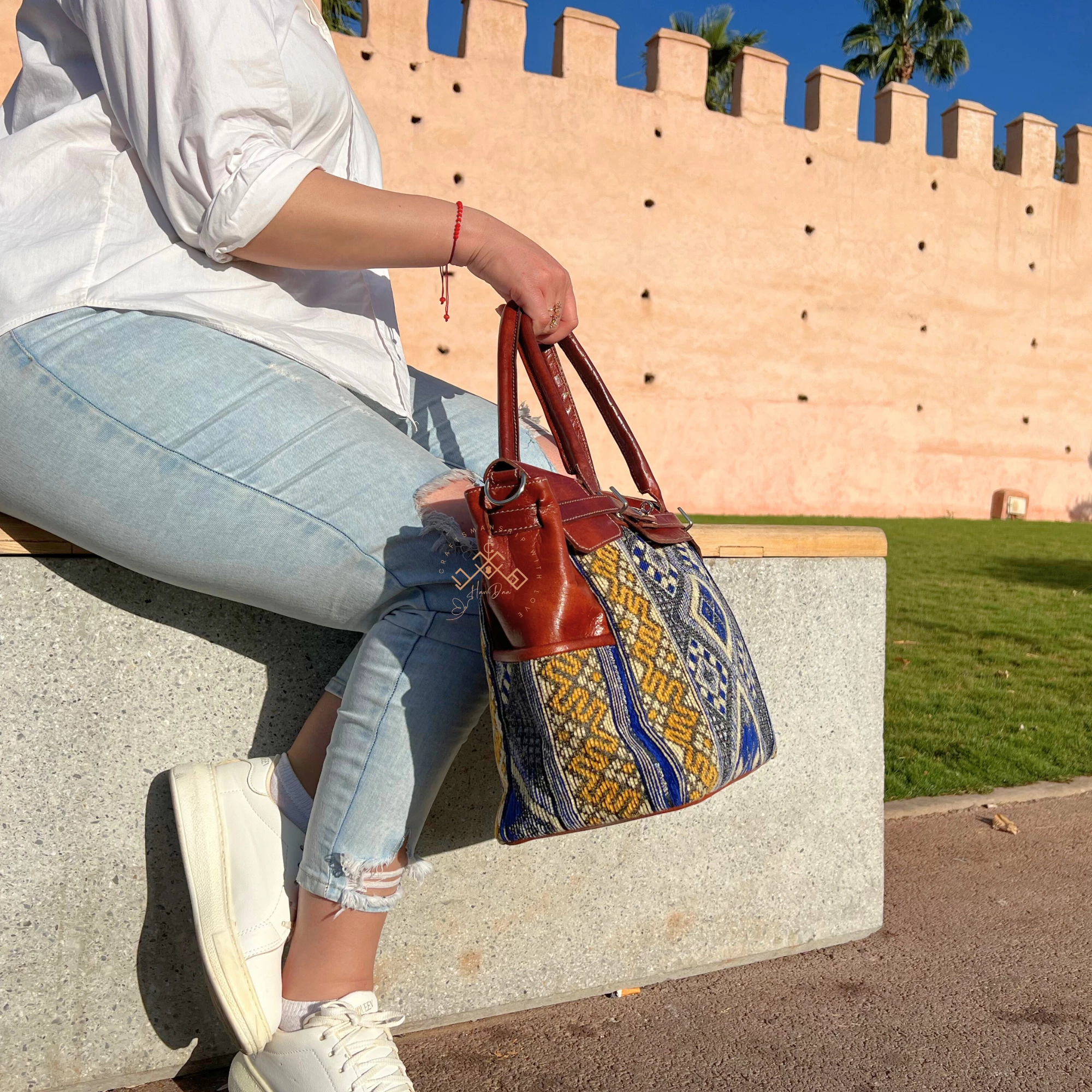 Brown Leather & Blue Kilim Handbag – Unique Carpet Tote bags