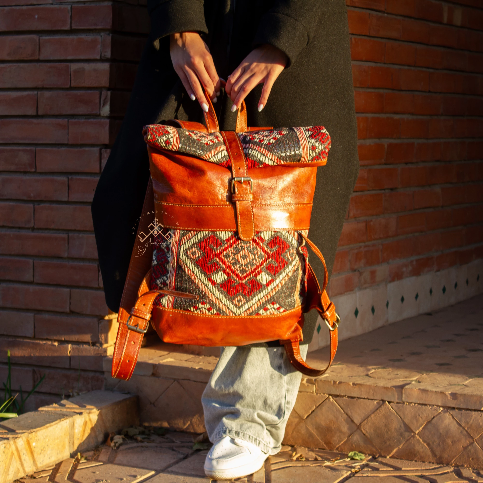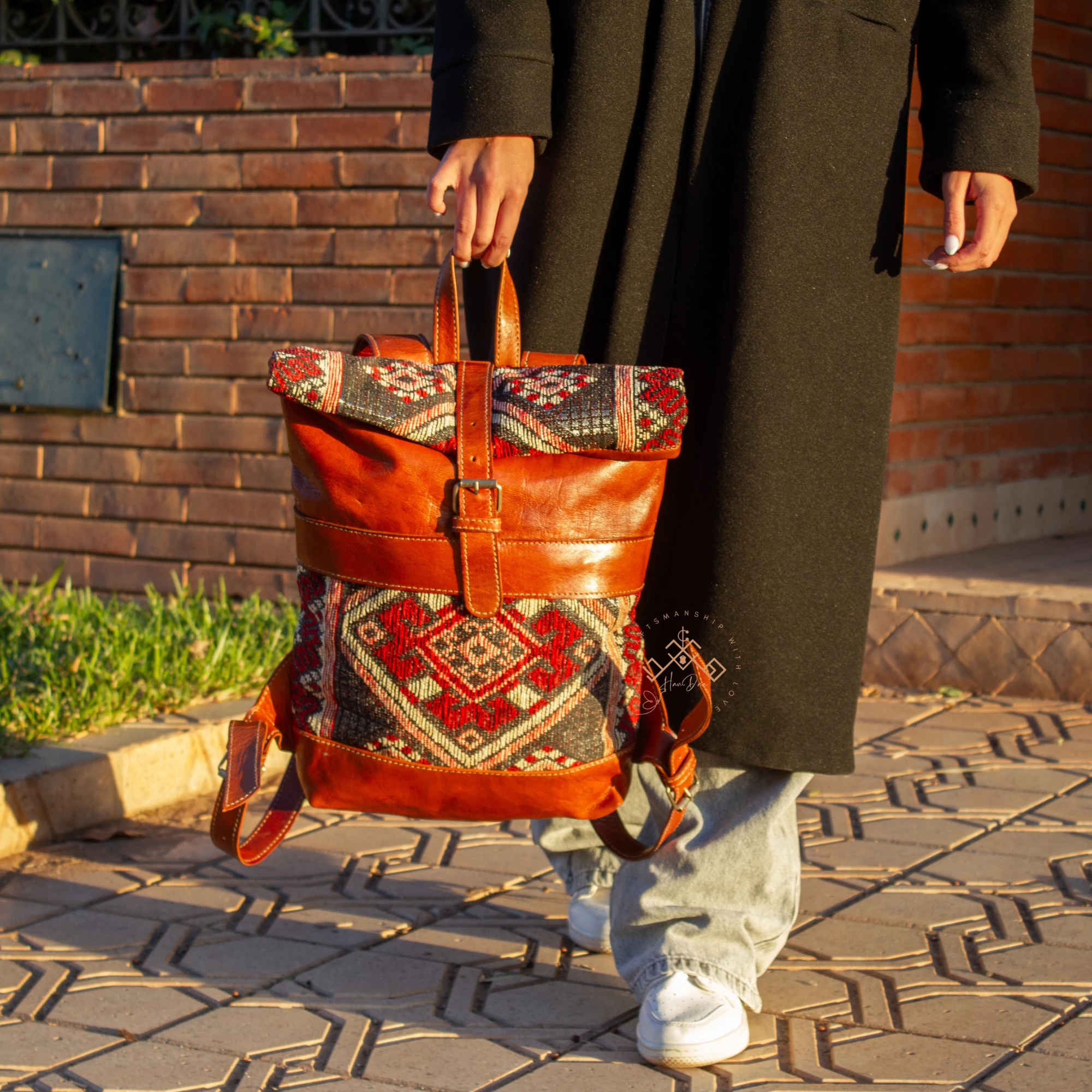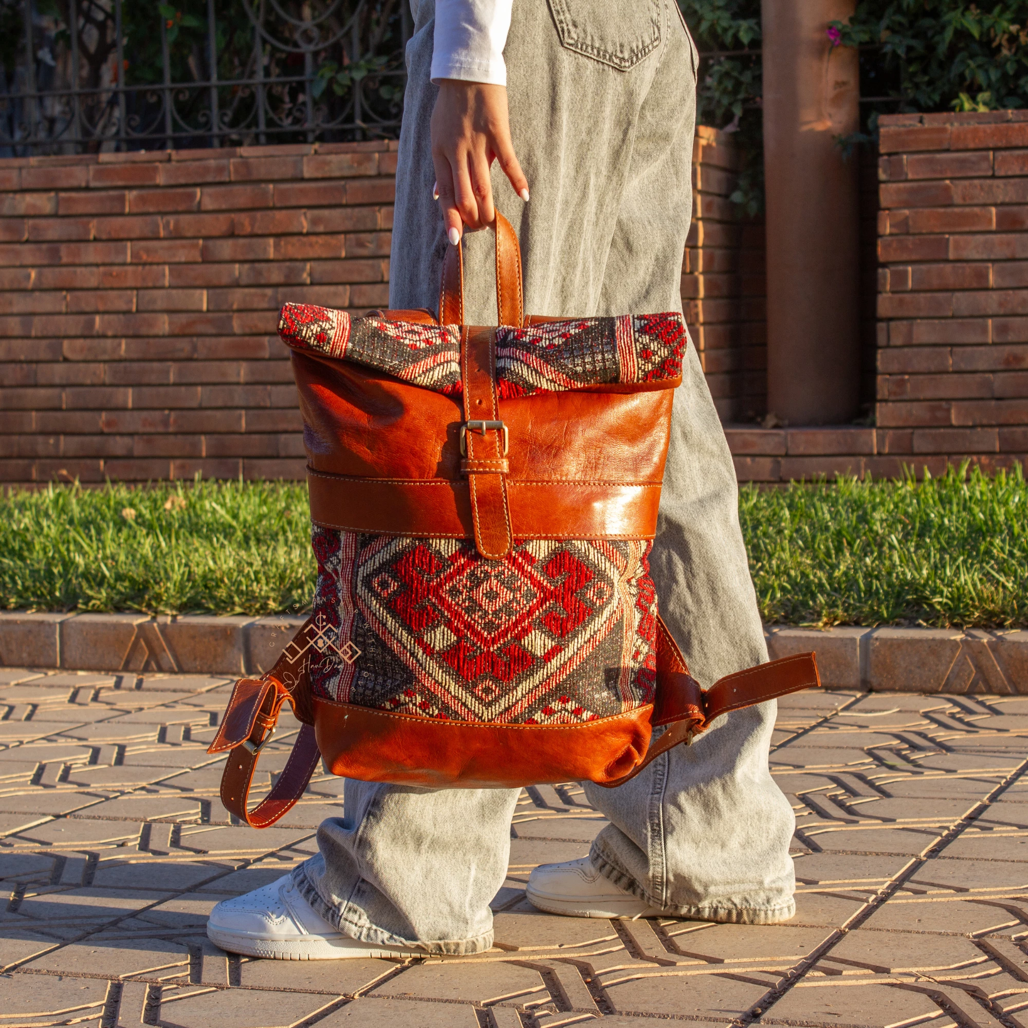 This classy roll-top leather backpack handcrafted with authentic Moroccan kilim and full-grain leather. Stylish, lightweight, and perfect for everyday use or travel. Each piece is one-of-a-kind — a true blend of tradition and boho elegance.