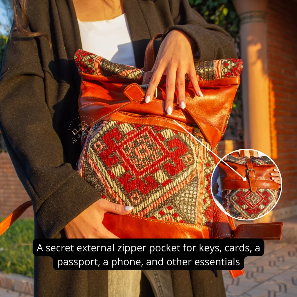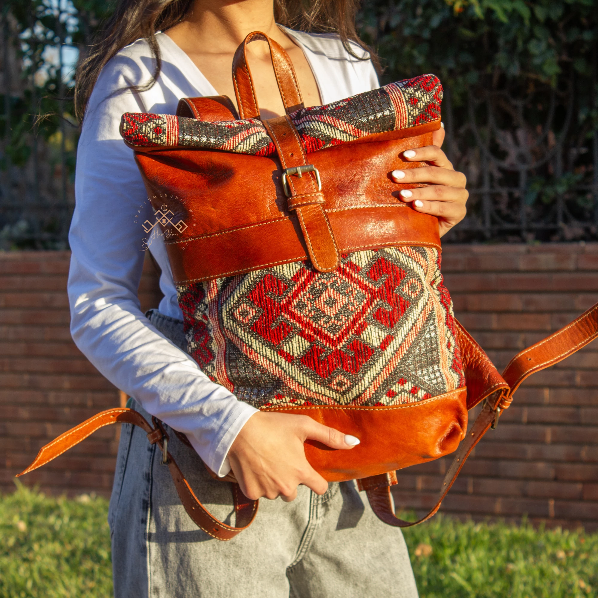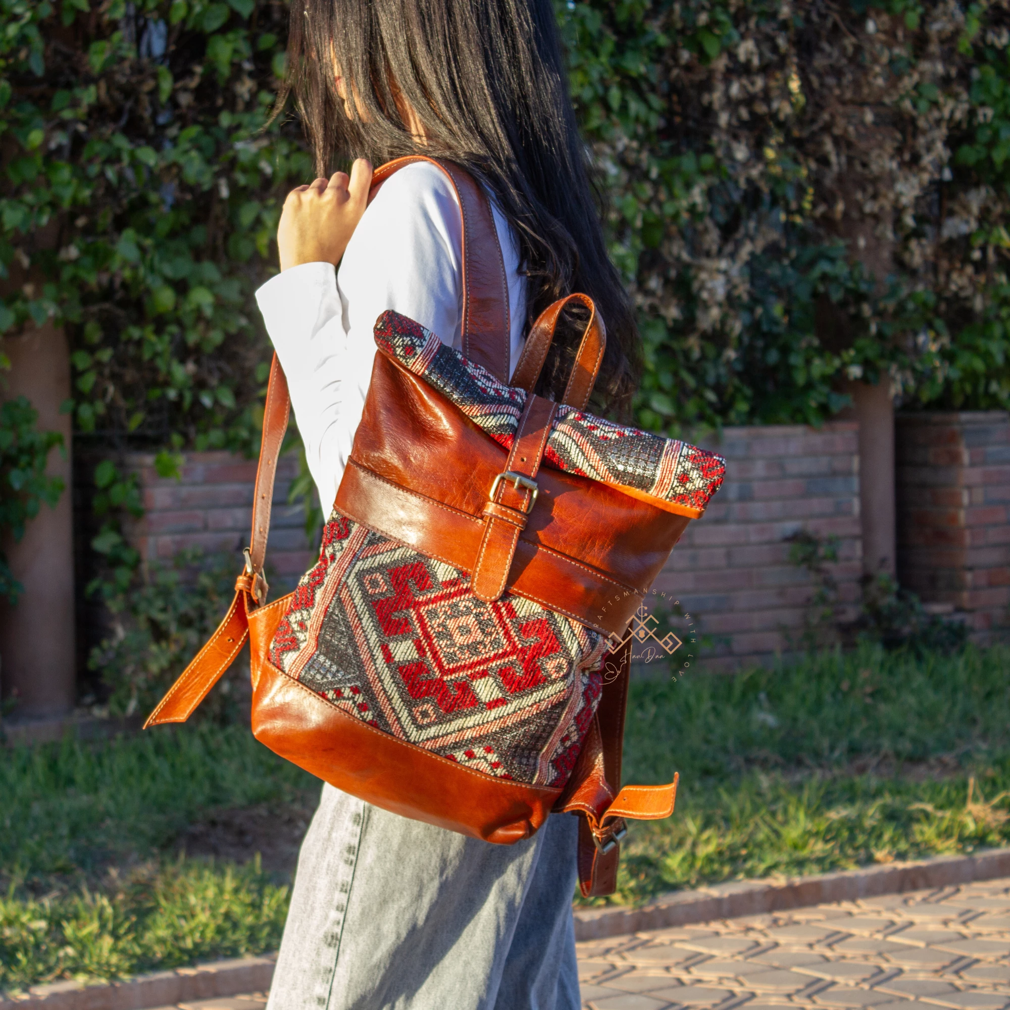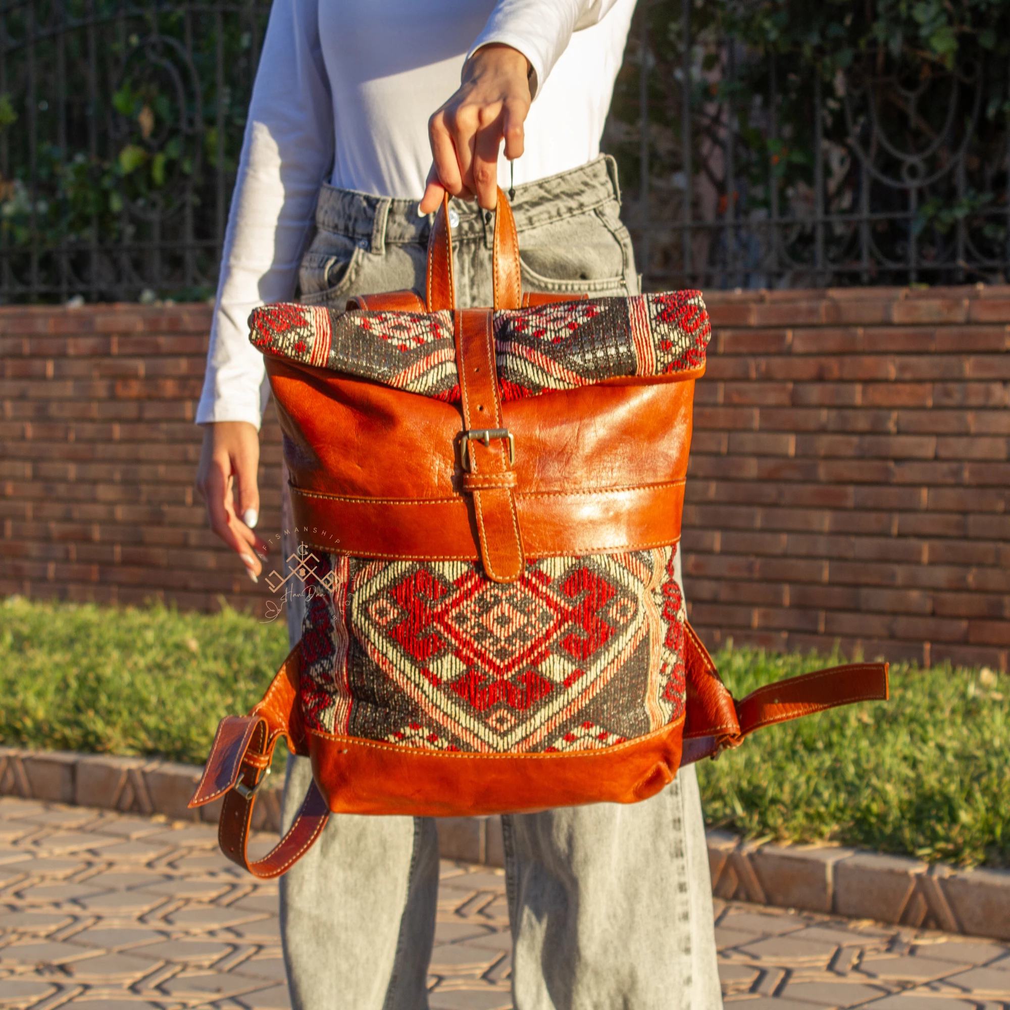 This classy roll-top leather backpack handcrafted with authentic Moroccan kilim and full-grain leather. Stylish, lightweight, and perfect for everyday use or travel. Each piece is one-of-a-kind — a true blend of tradition and boho elegance.