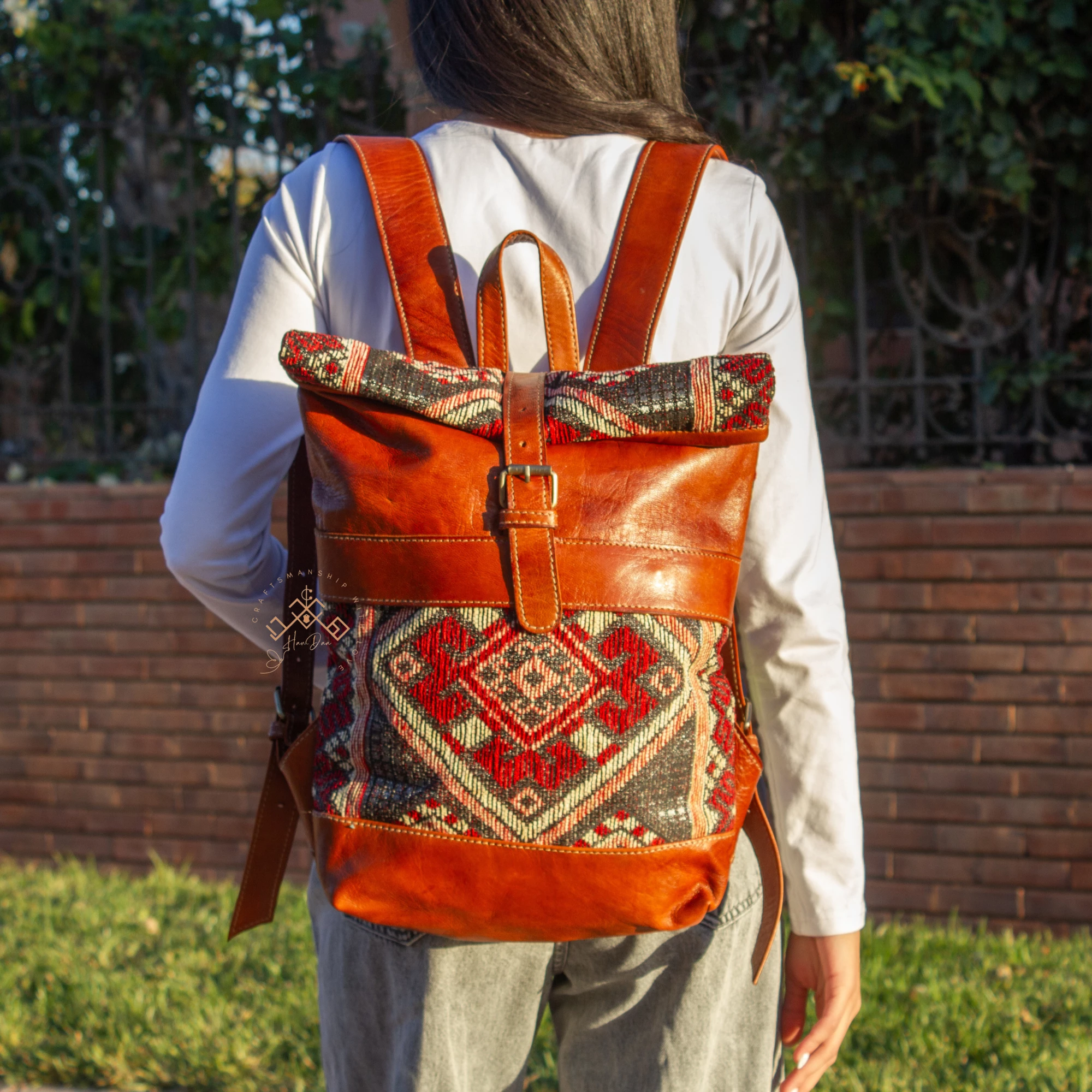 Havan Leather Roll Top Backpack - Unique Kilim Travel Bag