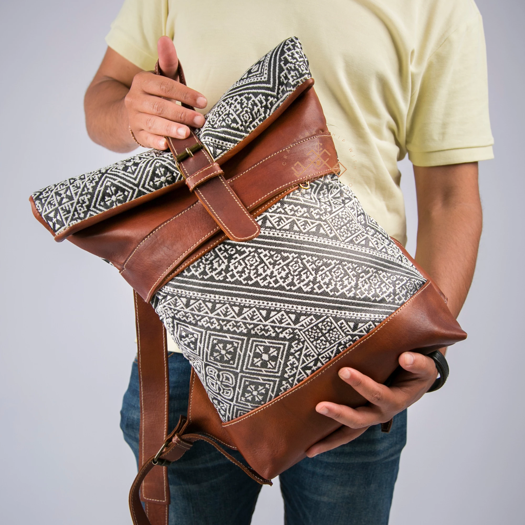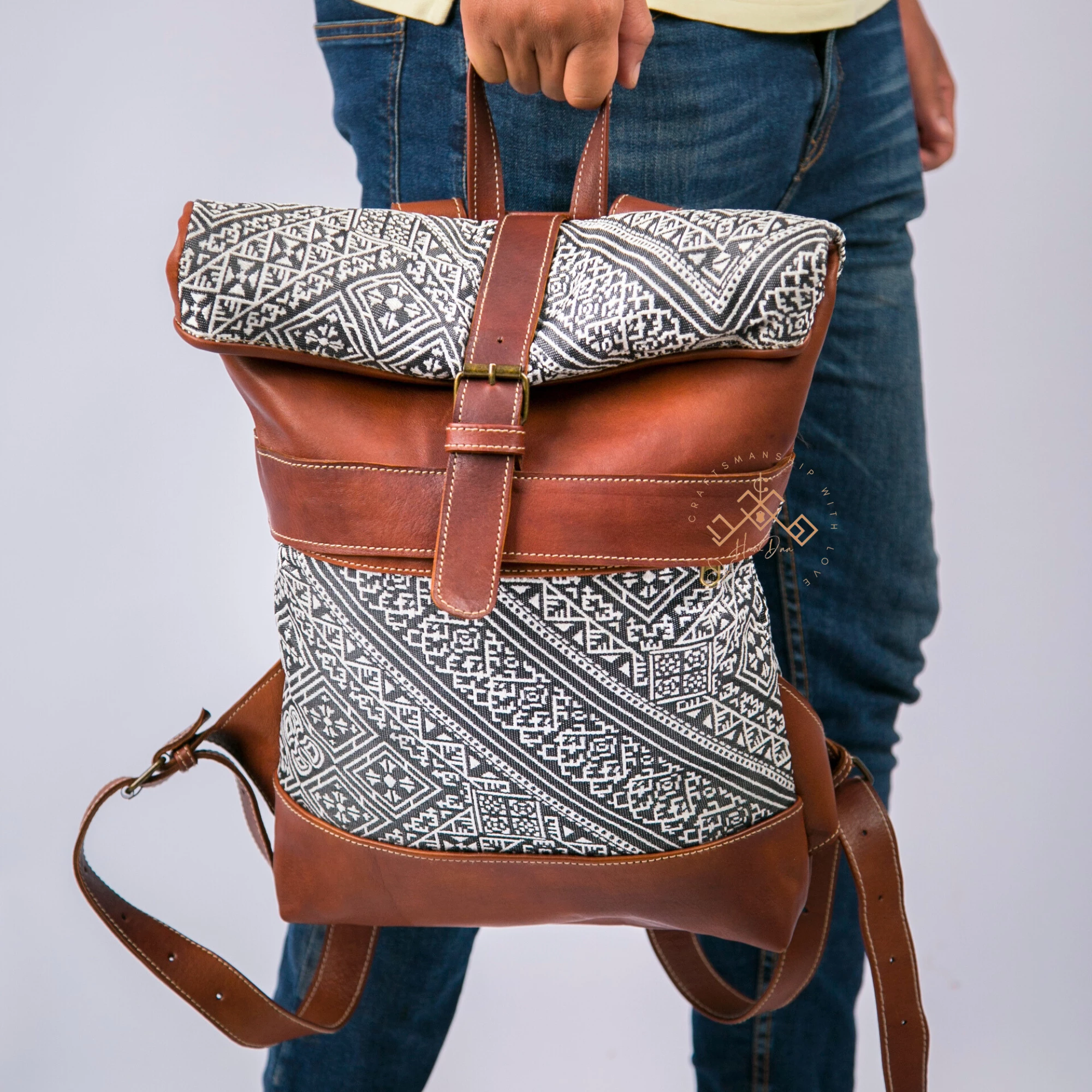 Brown Roll Top Leather Backpack with Unique Kilim