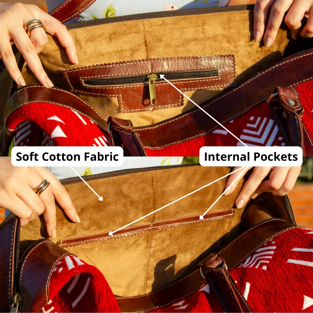 Handmade Red Kilim Travel Leather Bag – Vintage Style weekender Bag