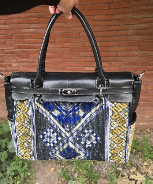 Discover the Large Brown Genuine Leather bag, a handcrafted Luxe Kilim Shoulder Bag for women. Spacious, durable, and uniquely designed with carpet.