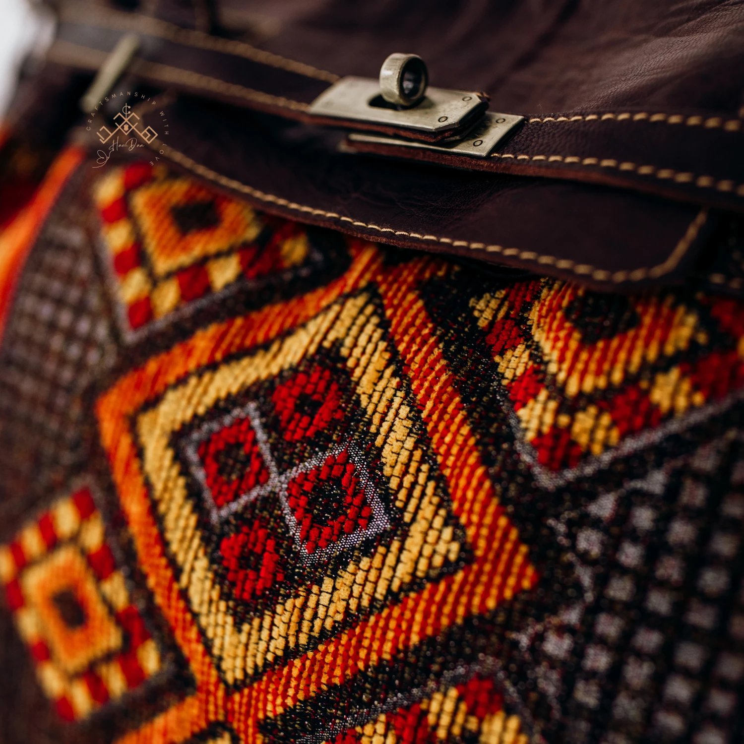 Discover the Luxe Kilim Shoulder Bag, a unique Brown Leather Handbag with Kilim details. Artisanal, durable, and highly stylish.