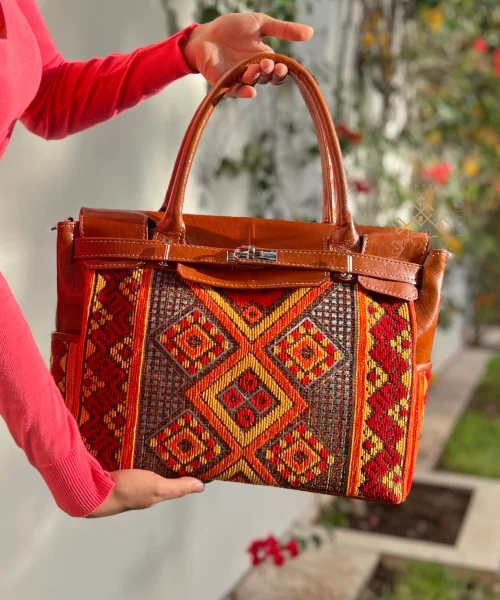 Discover the Luxe Kilim Shoulder Bag, a unique Brown Leather Handbag with Kilim details. Artisanal, durable, and highly stylish.