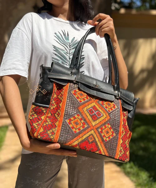 Discover the Luxe Kilim Shoulder Bag, a unique Brown Leather Handbag with Kilim details. Artisanal, durable, and highly stylish.