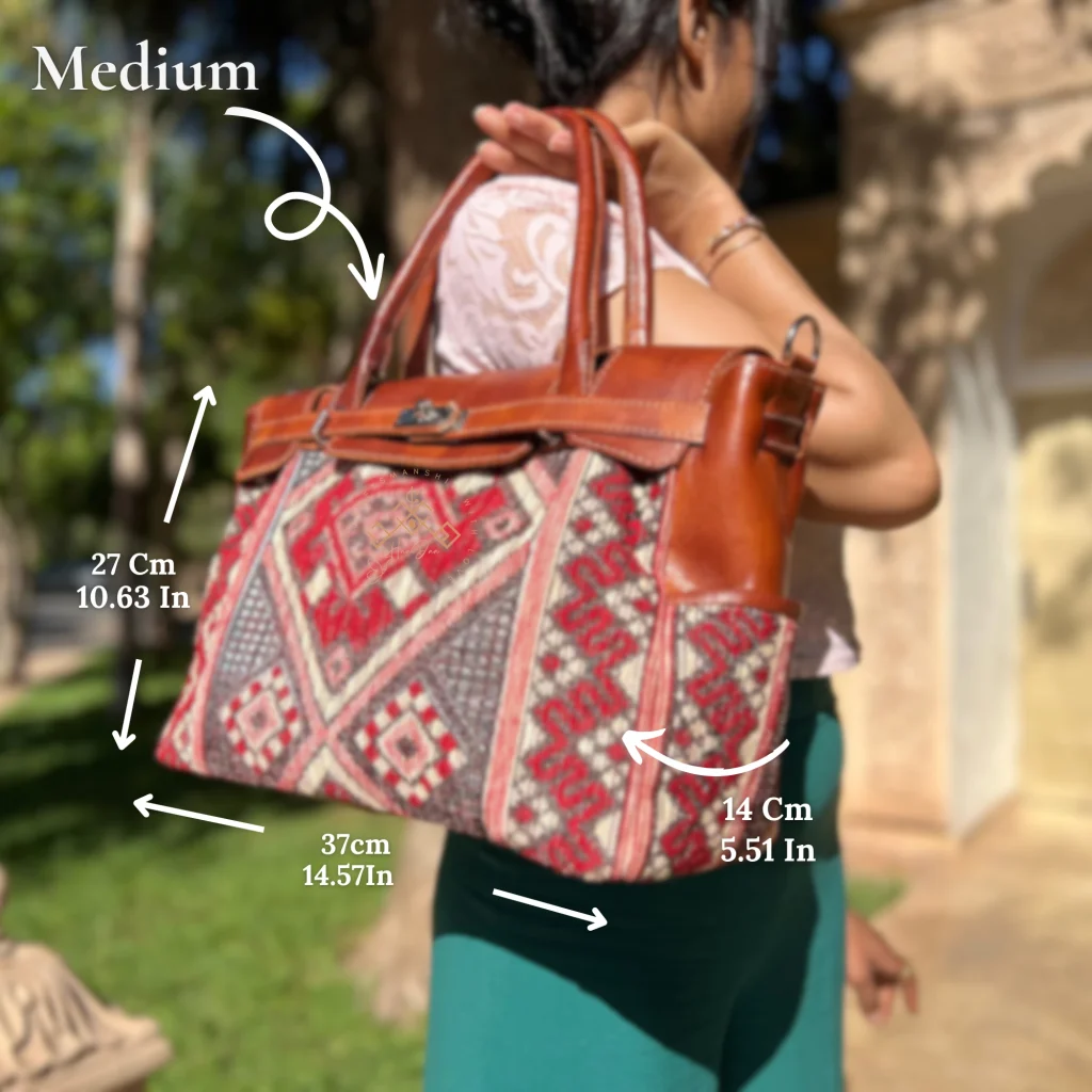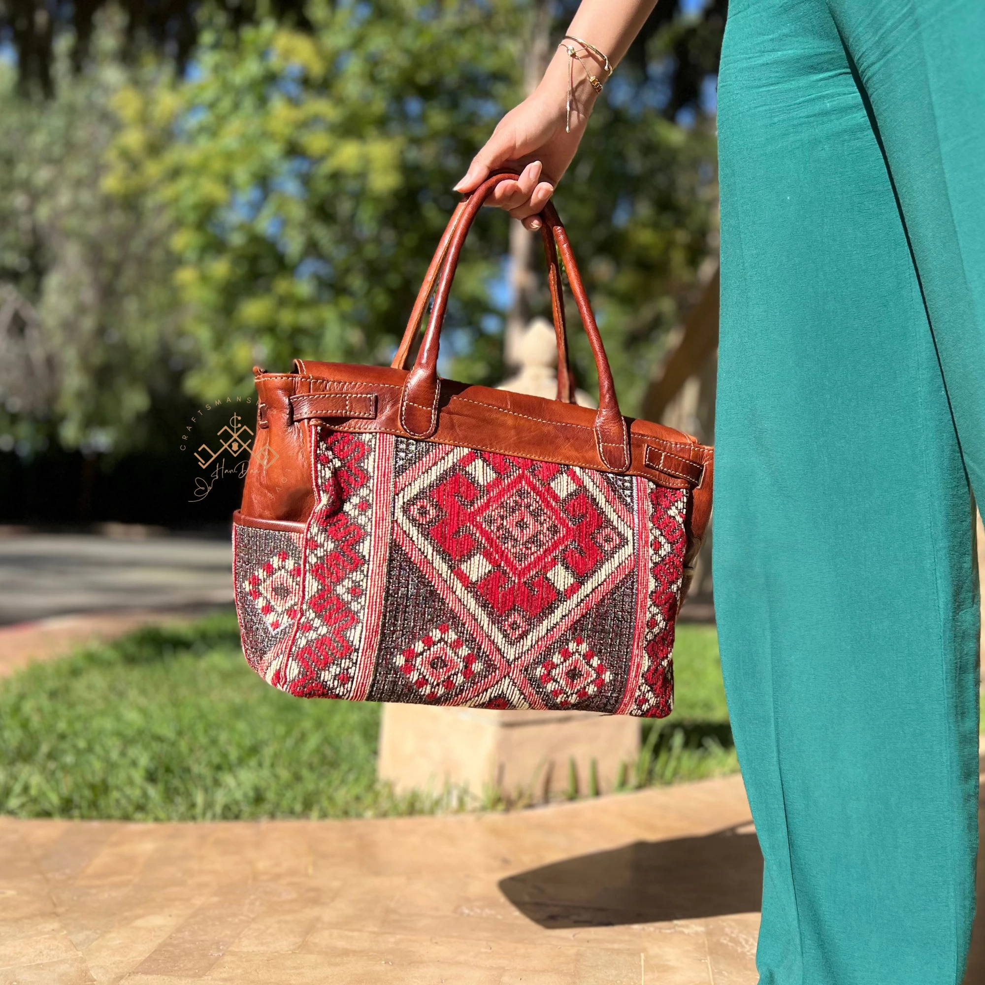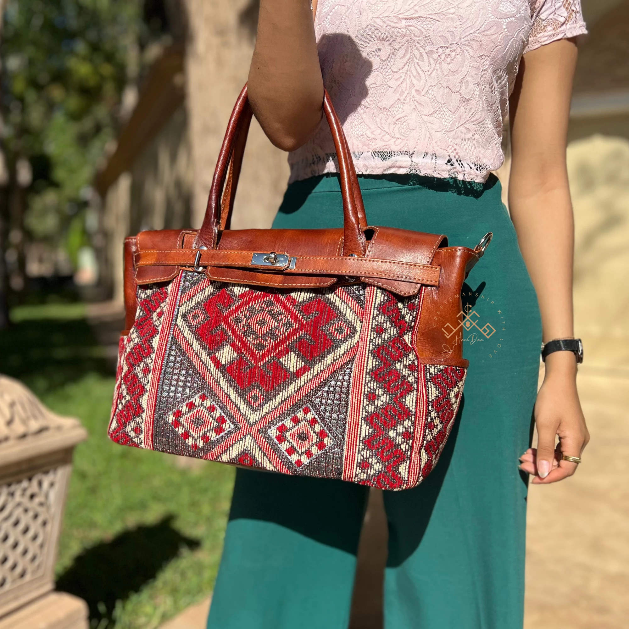 Crafted from rich, genuine brown leather, this handbag promises enduring quality that deepens in character over time. The striking focal point is the authentic red Kilim panel, which ensures that every bag is a one-of-a-kind masterpiece.
