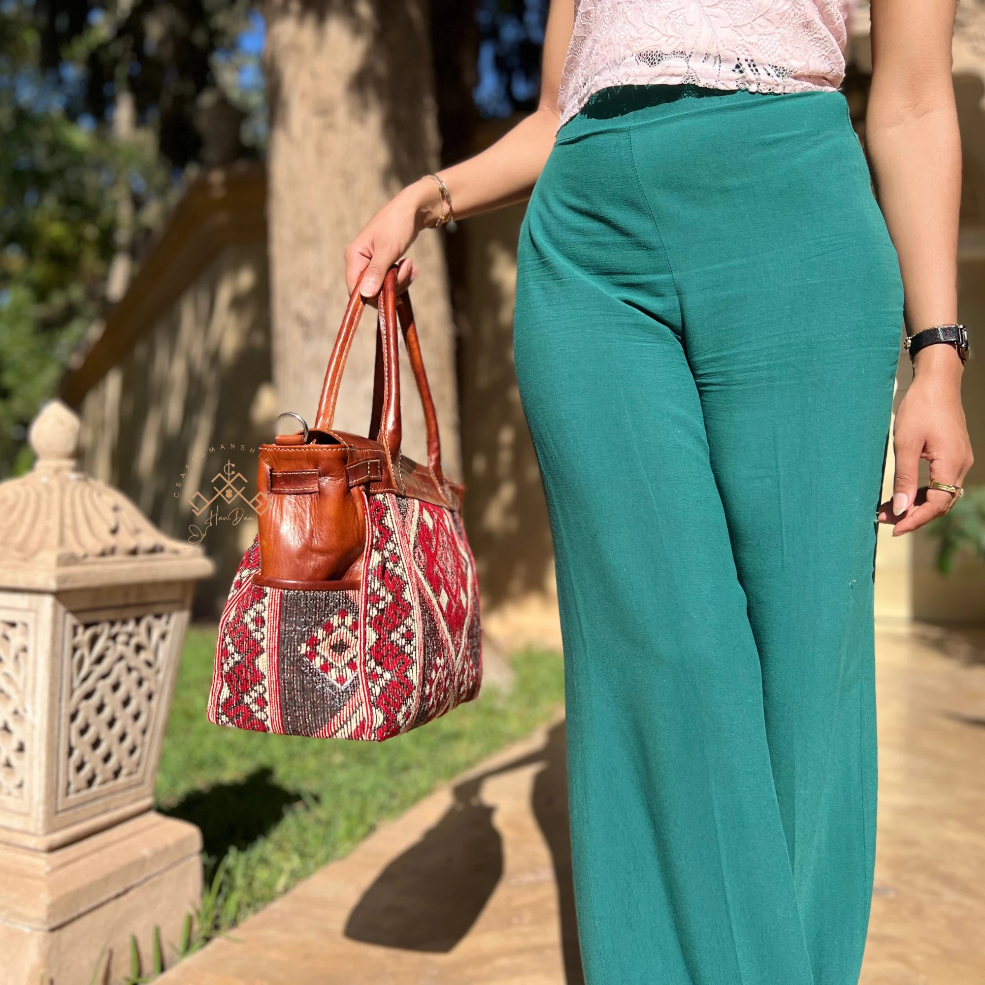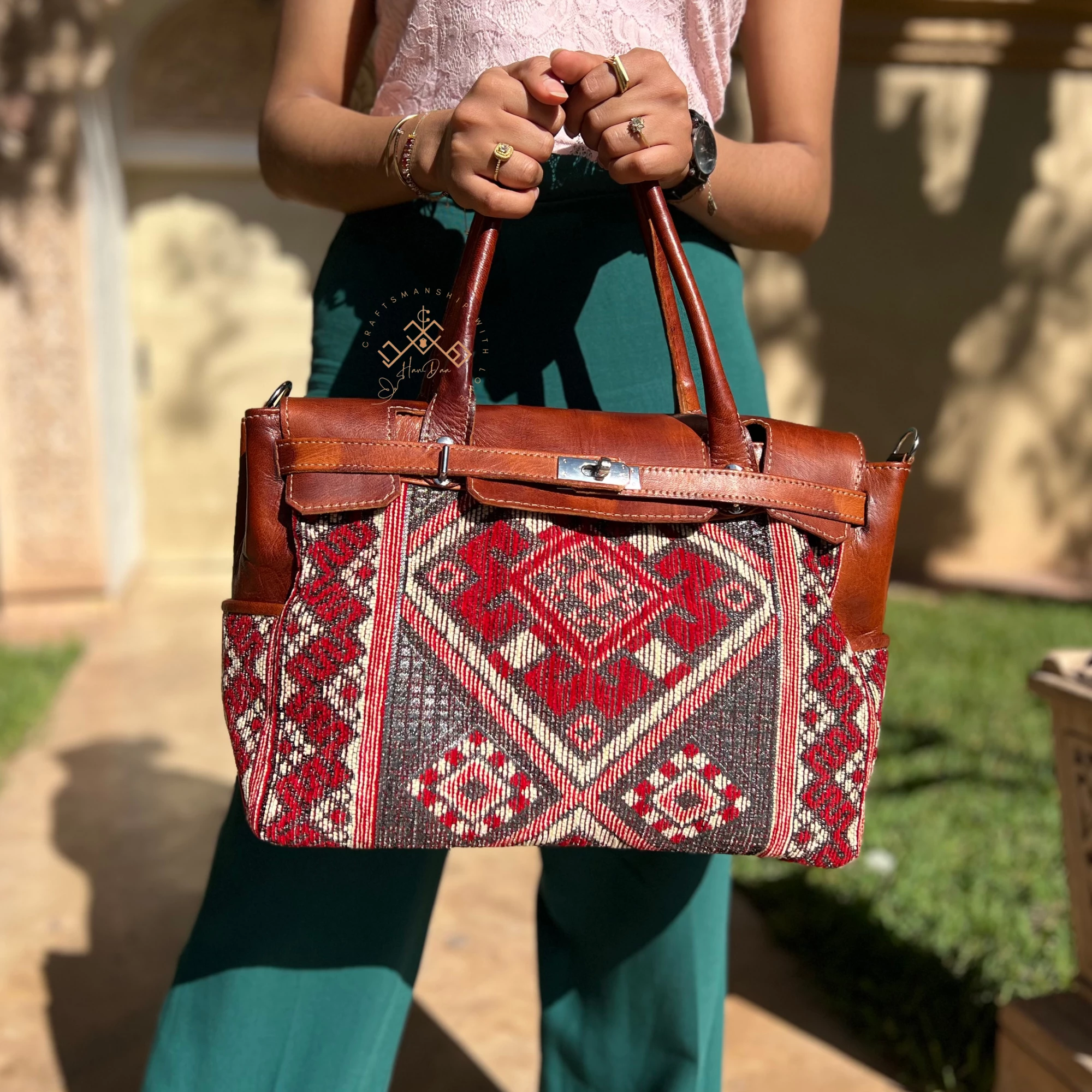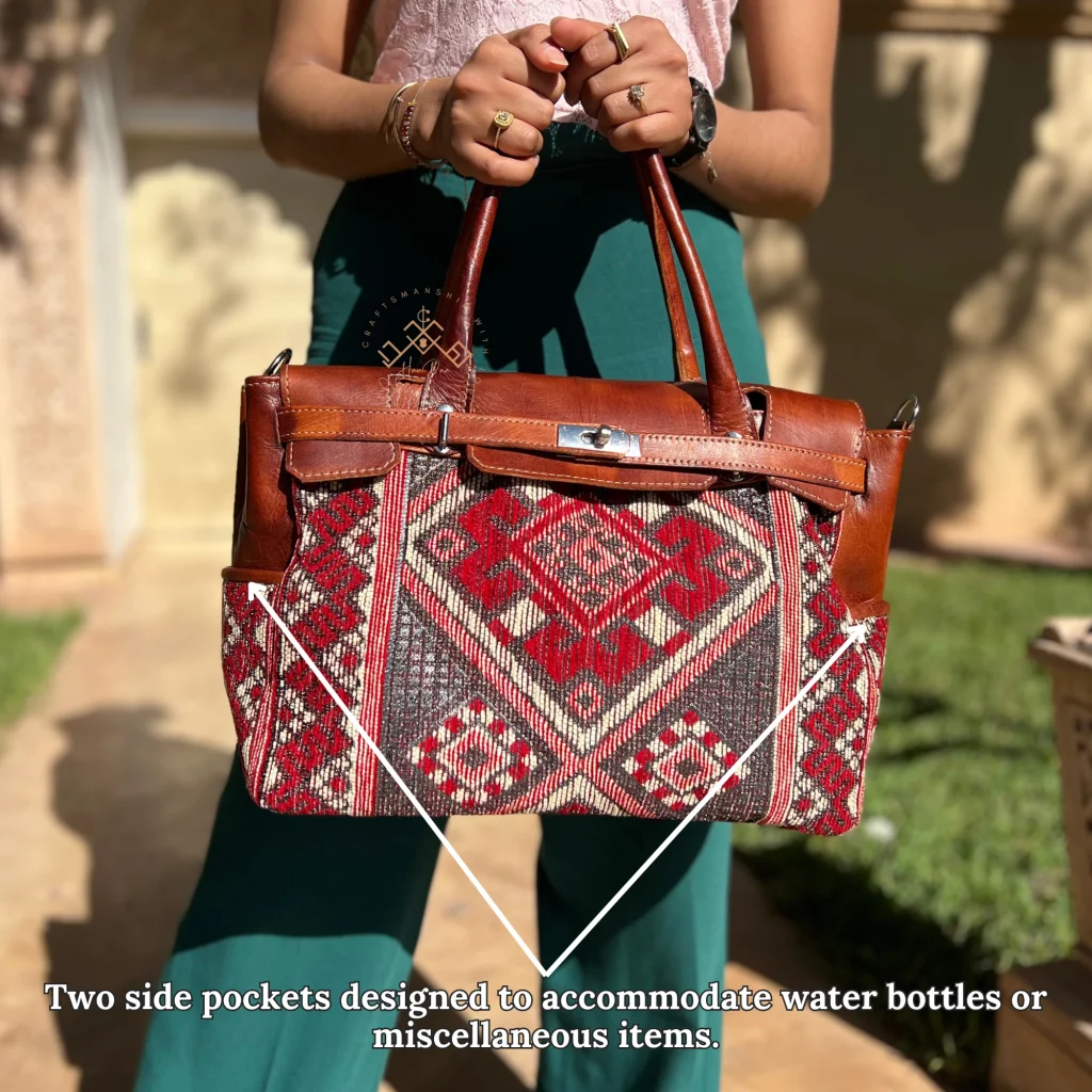 Crafted from rich, genuine brown leather, this handbag promises enduring quality that deepens in character over time. The striking focal point is the authentic red Kilim panel, which ensures that every bag is a one-of-a-kind masterpiece.