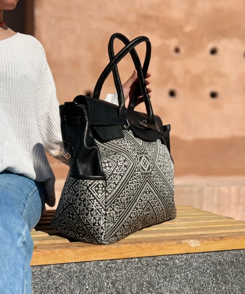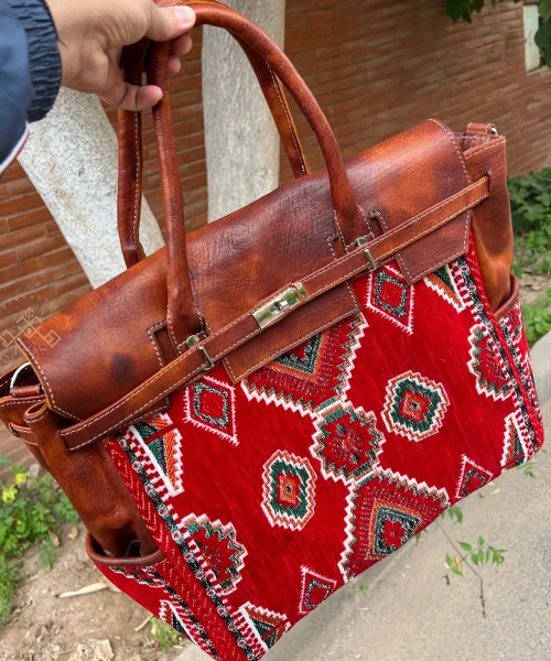 Moroccan Leather Kilim Handbag – Boho Red Carpet Tote Bag
