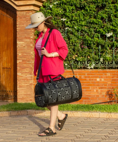 Large Black Leather Kilim Weekender Bag – Moroccan Travel Duffel